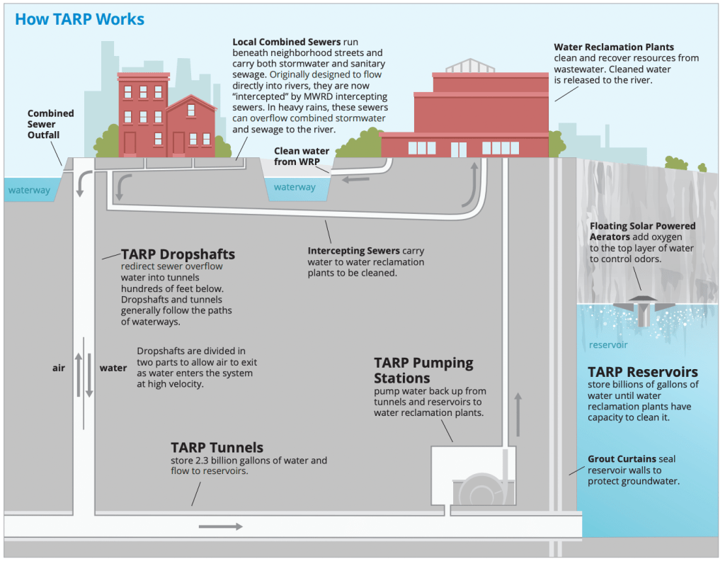 This story starts about 360 feet below our feet, much of it being underneath the city’s South and West sides. Called the “Deep Tunnel”, cavernous networks of flood tunnels and emptied reservoirs serve as routes to hold extra water until it can be diverted and treated at the city treatment plants.